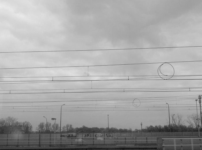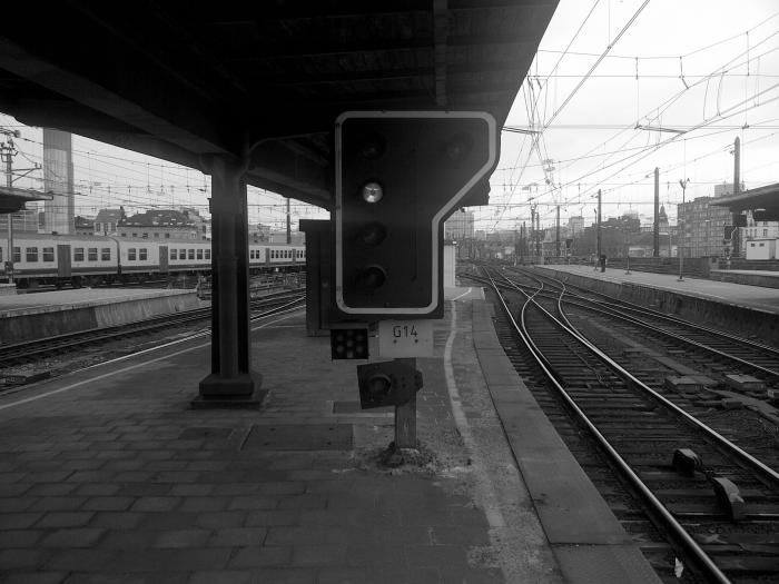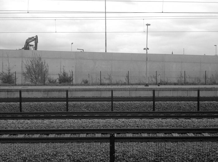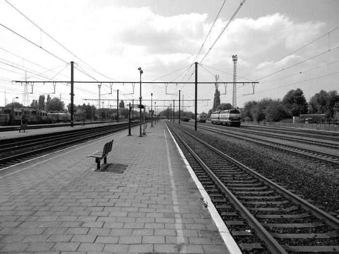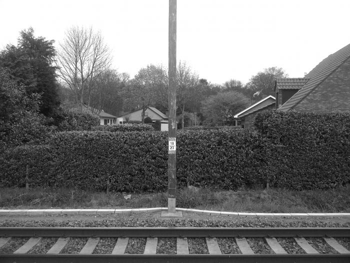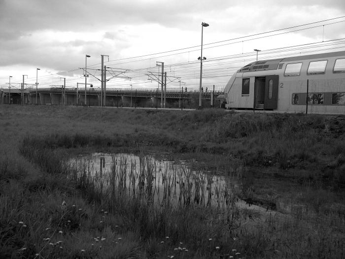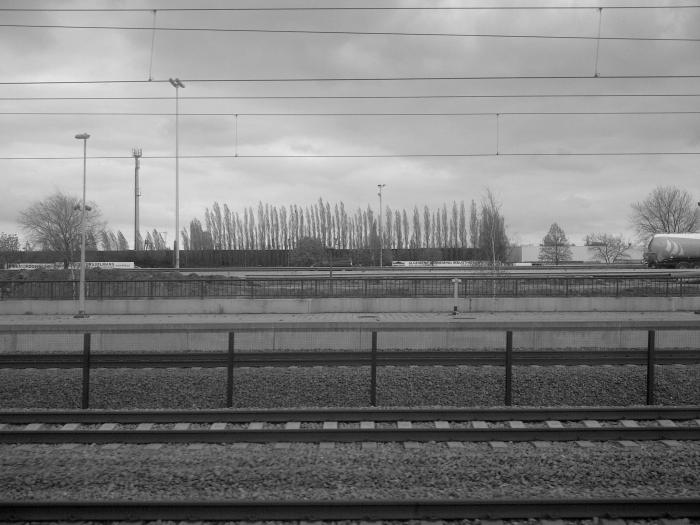 Je kijkt door het raam. Boven: de hemel, kabels en boomtoppen. Achter (links of rechts): het verleden, vervormde vergezichten, gehaaste blikvelden voorbij. Beneden: spoorstaven en dwarsliggers, (ongewenst maar noodgedwongen) betrokken en bevolkt met restanten van menselijke secreties en ander afval (divers maar vaak onzichtbaar op het eerste zicht), evenwijdig liggend onder jouw zitplaats, die (de zitplaats) elk metalen punt heel even raakt via de rechtlijnige beweging van de trein in volle vaart. Zonnestralen verdrogen de humide residus die traagzaam inkrimpen tot kleine nietigheden: verschraalde onzichtbaarheden die hun aanwezigheid verbergen binnen de ijzeren contouren. Sporen van tijdelijkheid. Aards en eindig. Vluchtig, voorbijgaand. De evenwijdigheid (van de sporen) neemt ons in de maling: ze geeft ons een gevoel van duurzaamheid, stabiliteit, harmonie, onverstoorbaarheid, gestadigheid maar vooral een gevoel van onveranderlijkheid. (En het vertoeven in anti-huiselijke treinwagons schenkt ons desalniettemin een geborgen, veilig gevoel, een bescherming tegen onder andere slechte weersomstandigheden en een garantie van aankomst op de gewenste bestemming.) We horen en voelen de cadans (1), de spoorwegberceuse, van de wielen over de rails, die we onwillekeurig vergelijken met de pulsatie van onze hartslag. Maar deze repetitieve manoeuvres versnellen en vertragen, zijn onregelmatig en onvolmaakt. Wissels zijn hoorbaar en veranderlijk. Wij stervelingen, reizen verder in het metrum van de existentiële tijdelijkheid. Alle bestemmingen en uurregelingen zijn vastgelegd (niet geheel onveranderlijk, toch vermeldenswaardig), de terminus is bepaald (begrensd). Maar datum en uur van de aankomst zijn niet bepaald. En de vergankelijkheid reist met ons mee, zonder (geldig) vervoersbewijs. We trachten ze (zo'n geldige biljetten) te vinden maar ze zijn (nog niet) te koop.